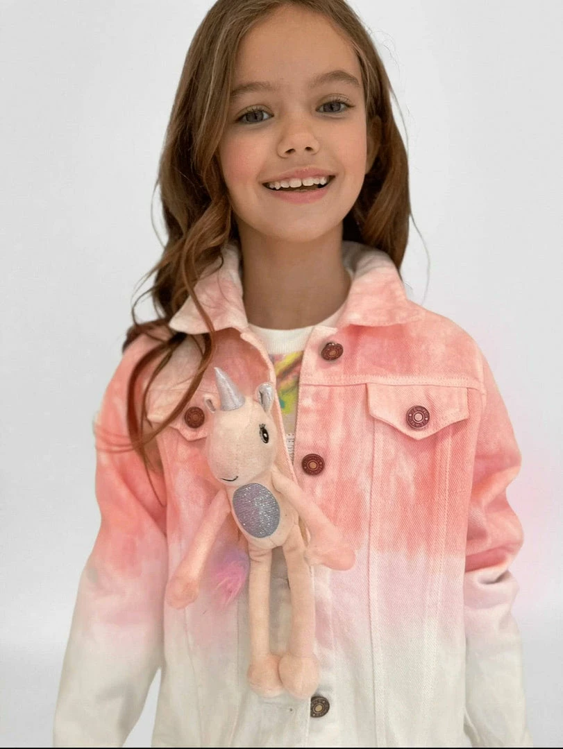 Dip dyed pink and white denim jacket with a 3D unicorn stuffed animal encrusted in crystal attached on the chest!ย