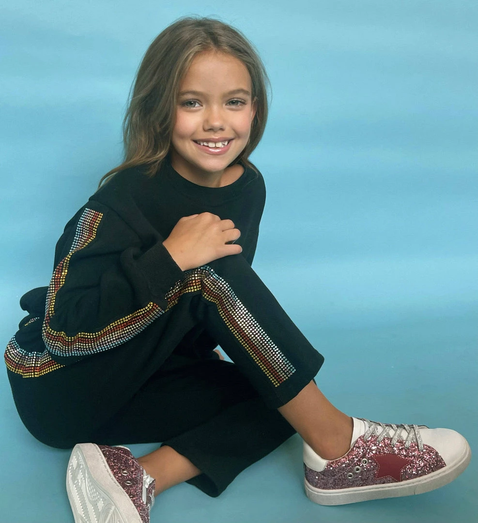 The coziest black crewneck and sweat pant set with metallic rainbow stipe down the arms and legs!ย