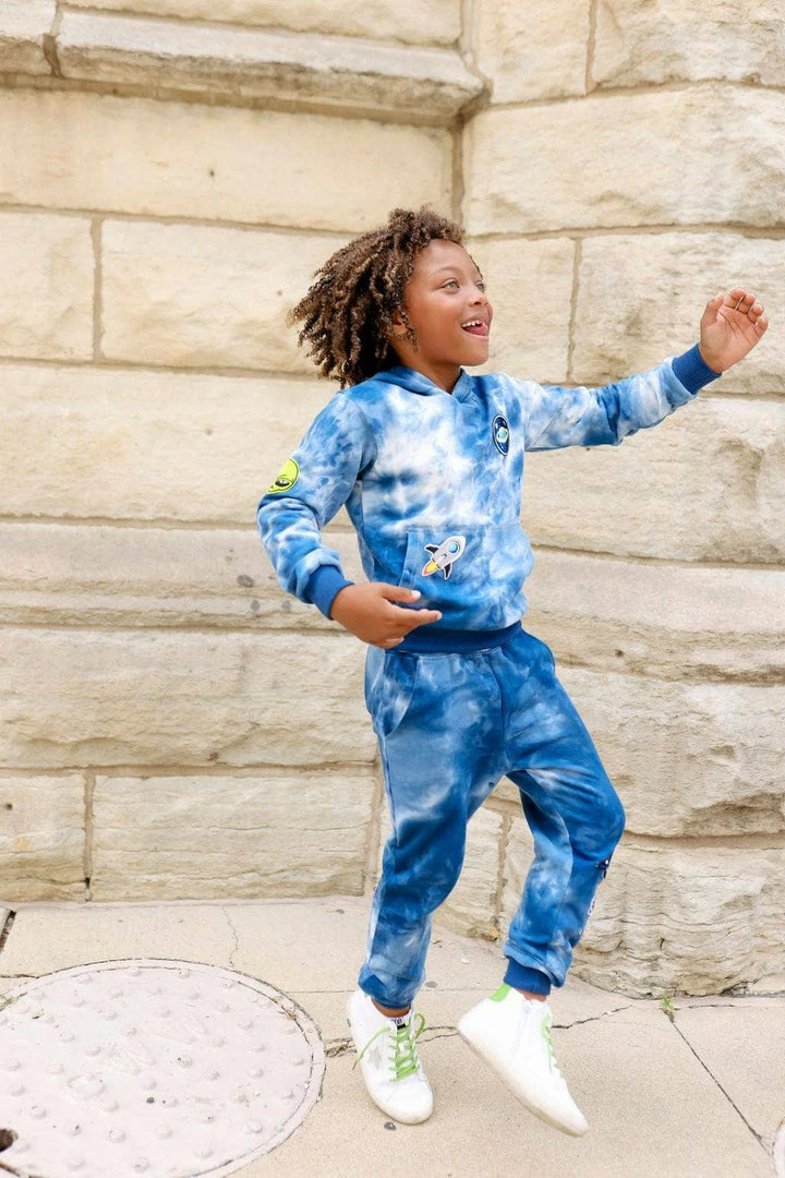 Tie dye French terry fabric with assorted astronaut themed patches.