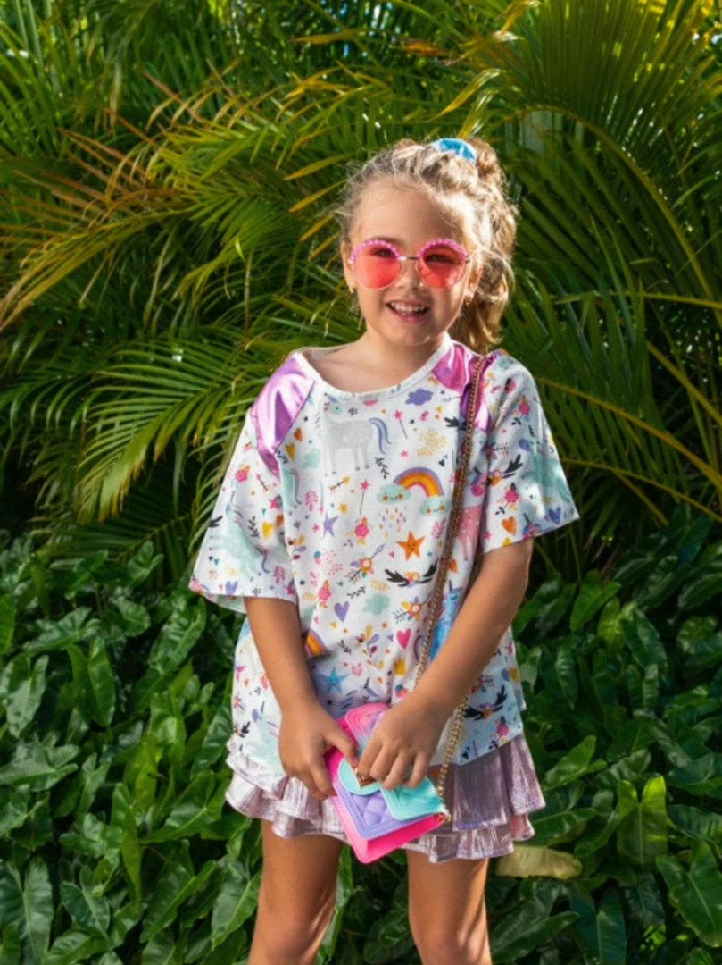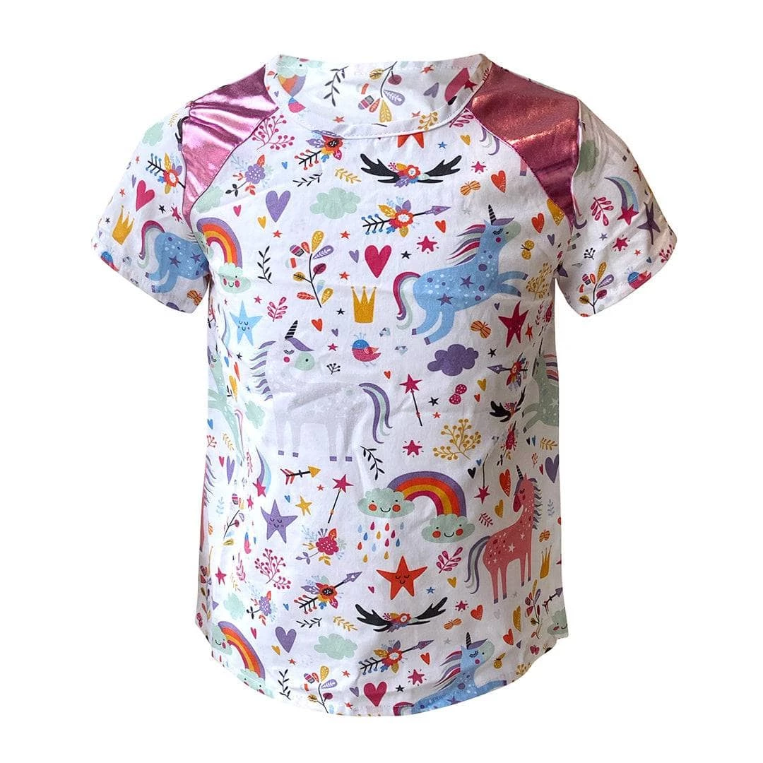 The most adorable, light weight tee in a light linen cottonwith pink metallic shoulders and doodle rainbow and unicorn art!