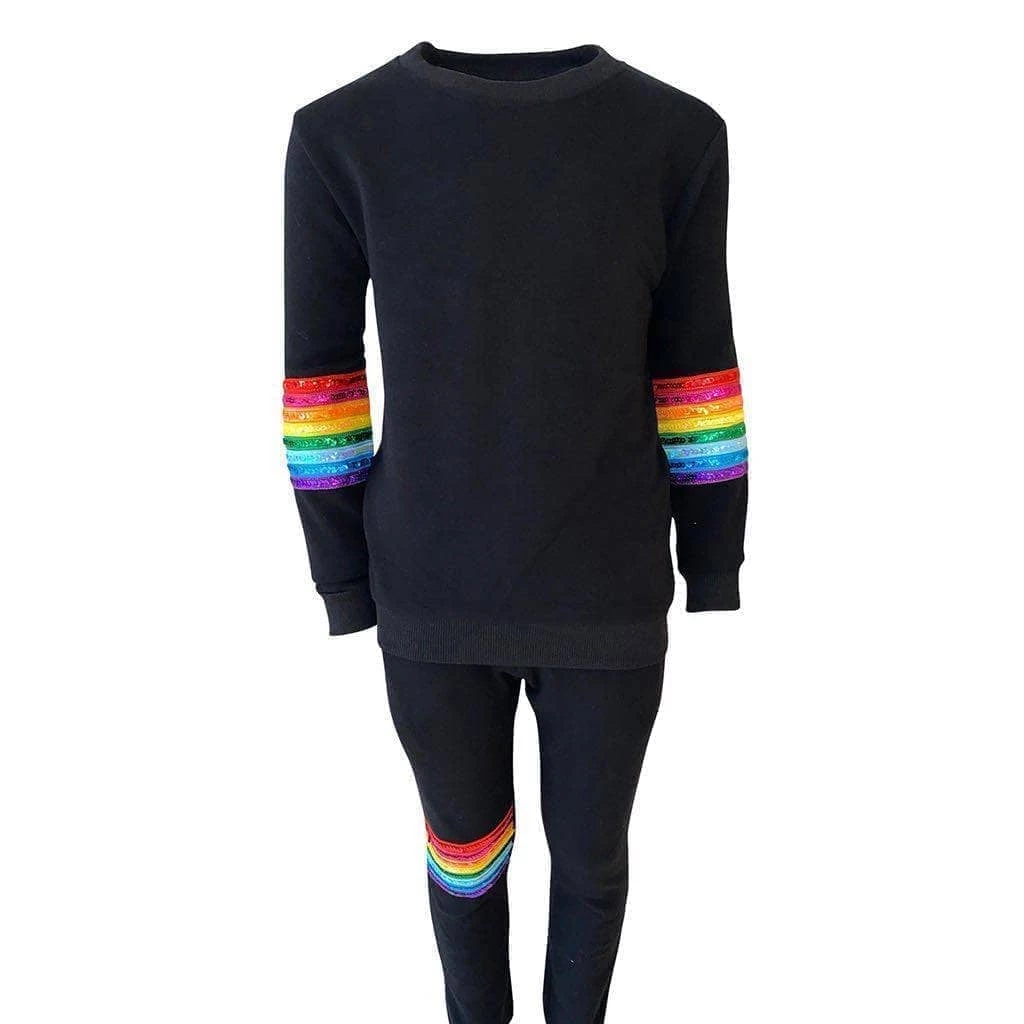 Super soft and warm black and rainbow sequin embellished sweat suit set. Perfect for cozy lounging or hitting the town! The best outfit for a sporty, girly, and spunky girl!ย