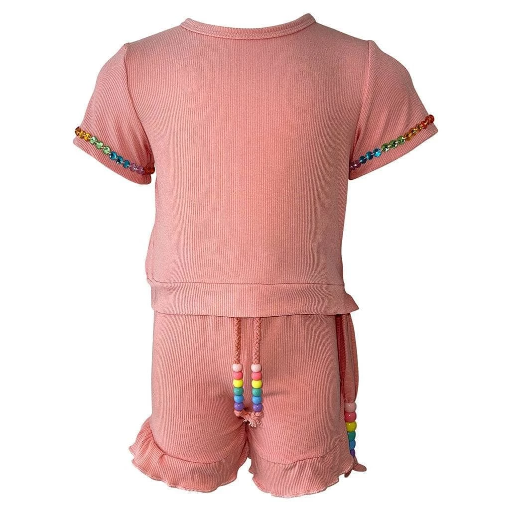 A matching shirt and shorts for your little ones. Designed with cute candy crystal beads on the shirt and candy beaded tassels.