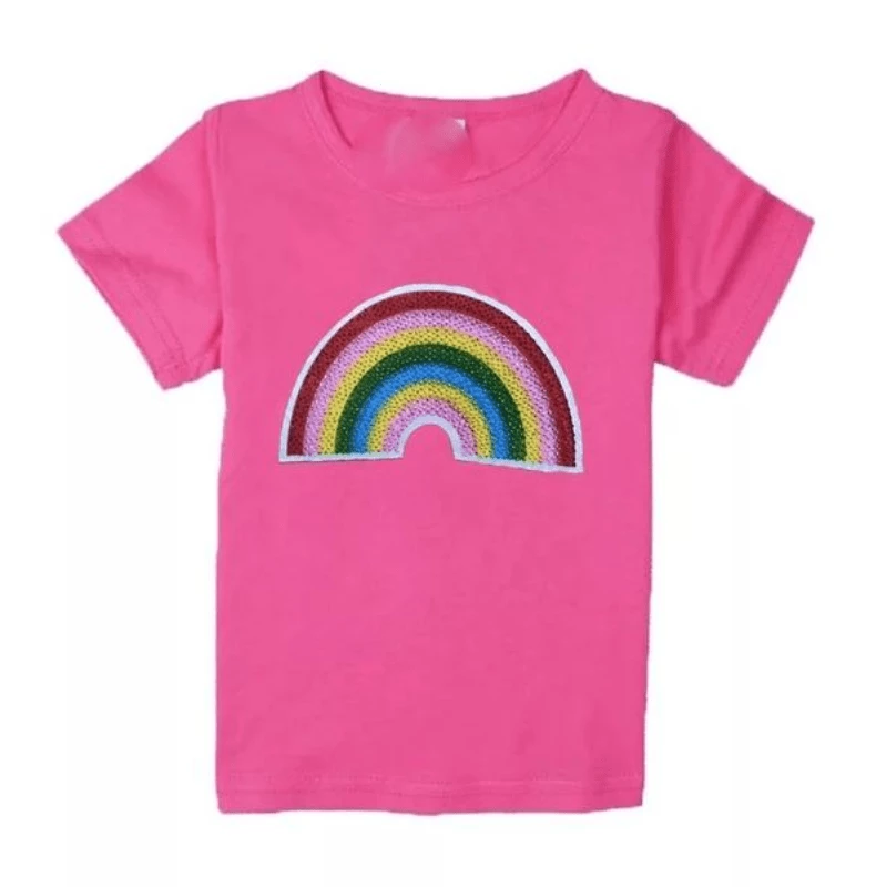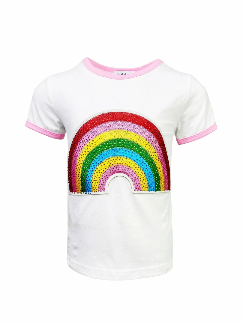 A rainbow made of colorful crystals makes this top a must have, in pink or white!