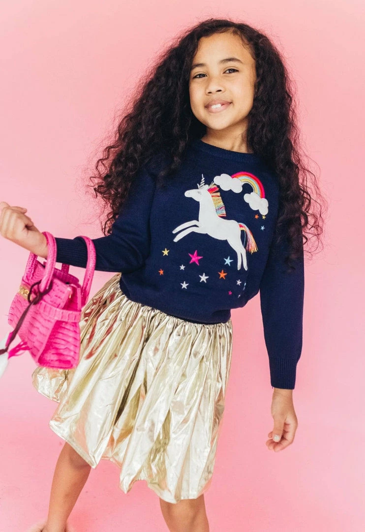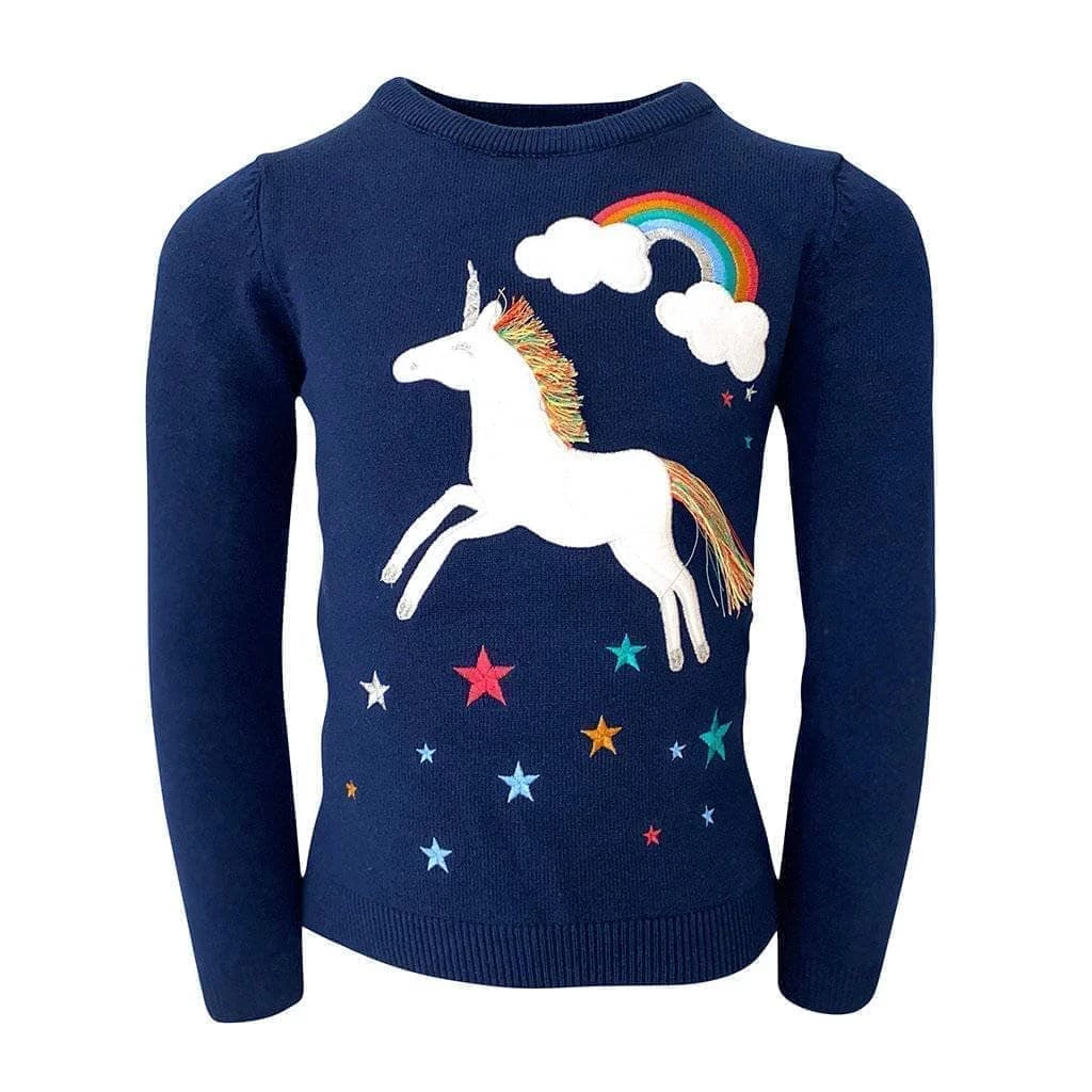 Super adorable fitted sweater with super soft and cozy cotton sweater with white unicorn with rainbow fringe mane and tail, stitched rainbow and cloud and stitched multicolored starsΒ