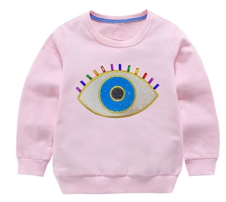Super soft and thick sweatshirt embellished with heavily beaded rainbow evil eye, coming in white and light pink sweatshirt colors
