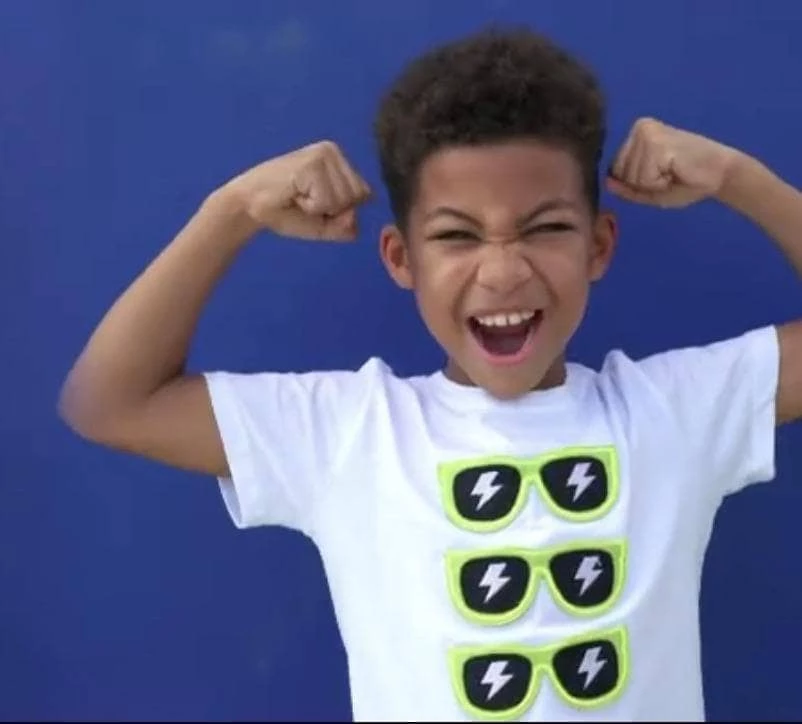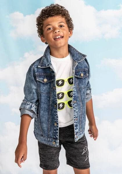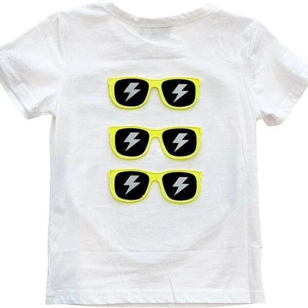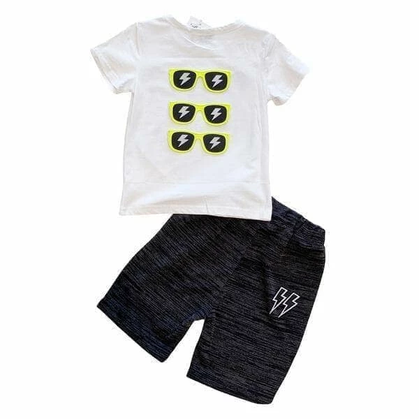 The best summer boys set! White tee with highlighter yellow lightning bolt sunglasses matched with grey lightning bolt shorts!