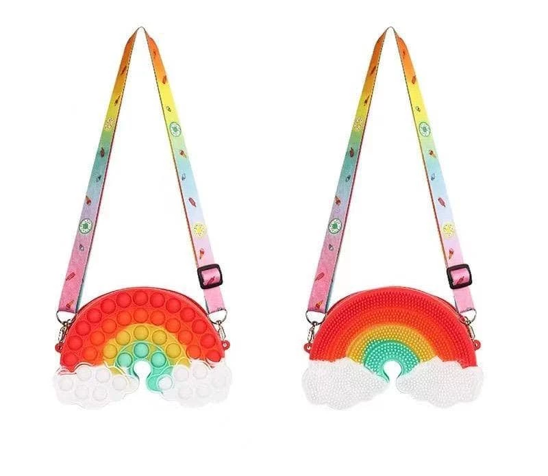 A bright, fun, rainbow shaped fidget crossbody with bright and vibrant colors!