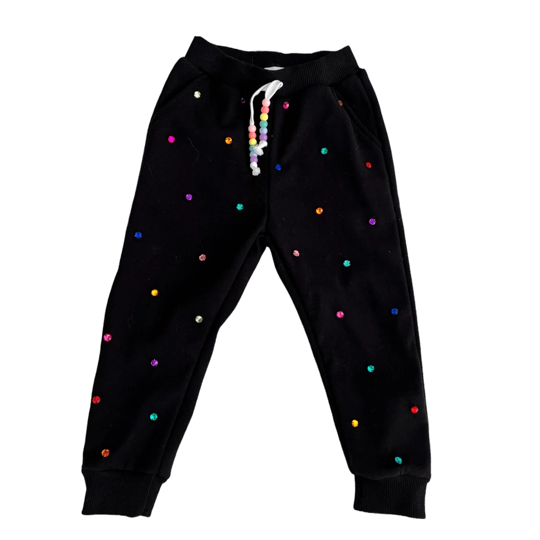 These black joggers are contrasted with bright colorful gems and a pastel rainbow of beads on the drawstrings.