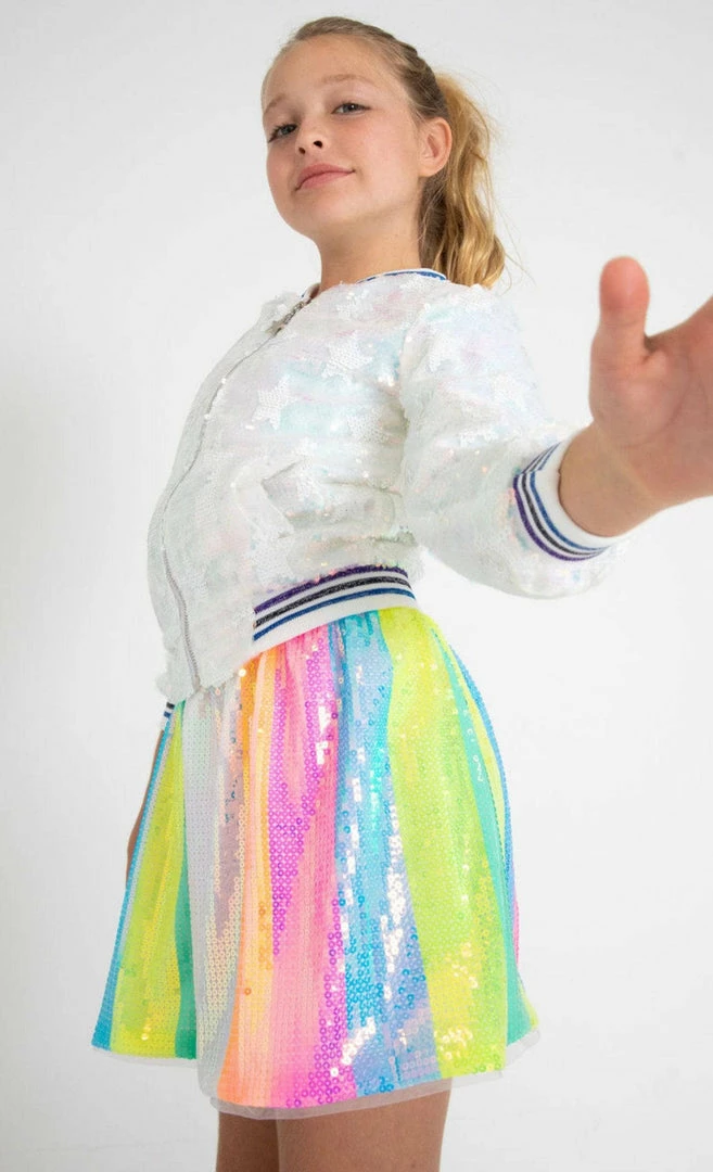 A shimmering skirt that matches most of the tops you can think of. Designed with colorful sequinned stripes.