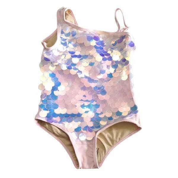 Pale pink paillette swimsuit with one thin strap and one thick!Β