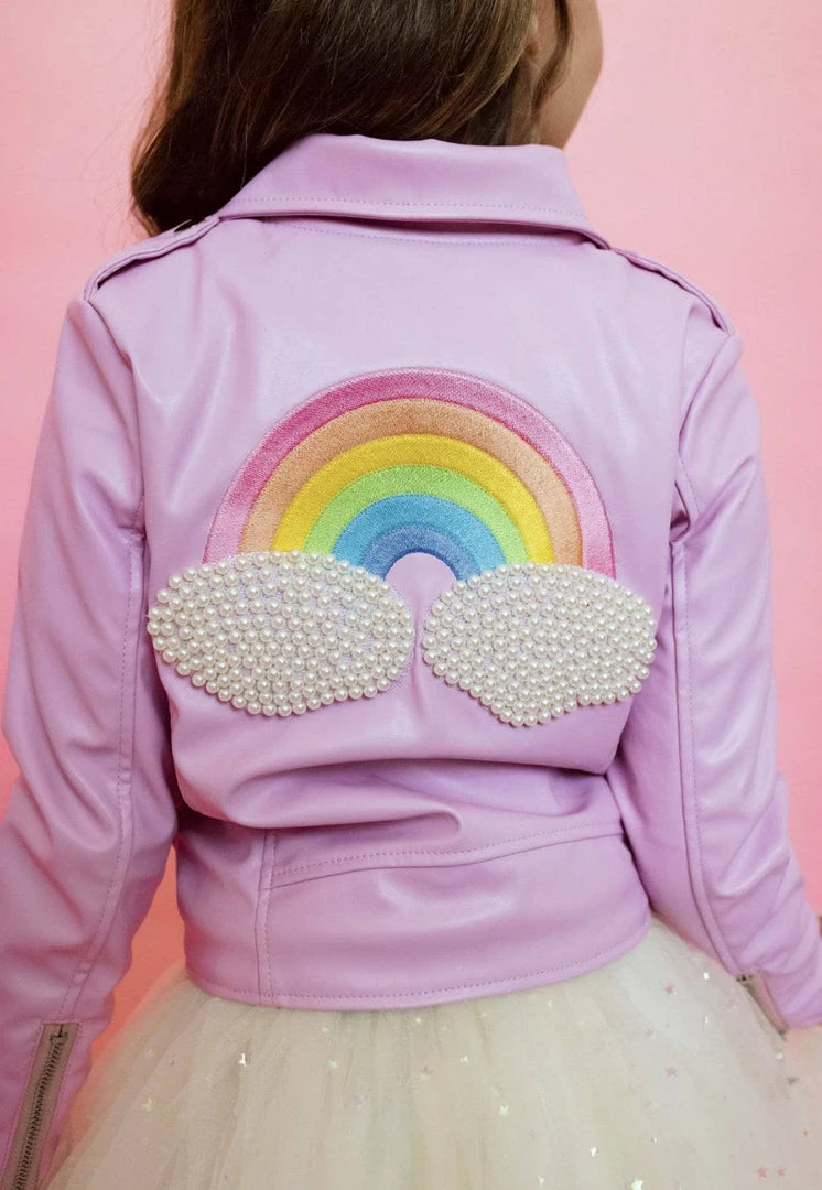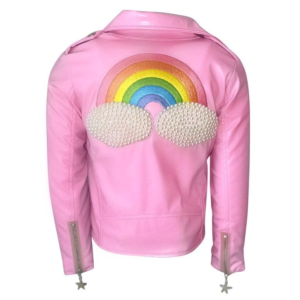 A pop of color to any outfit with this baby pink vegan leather jacket with a beaded rainbow and pearl patch on the back! Lined with super soft fleece liningย