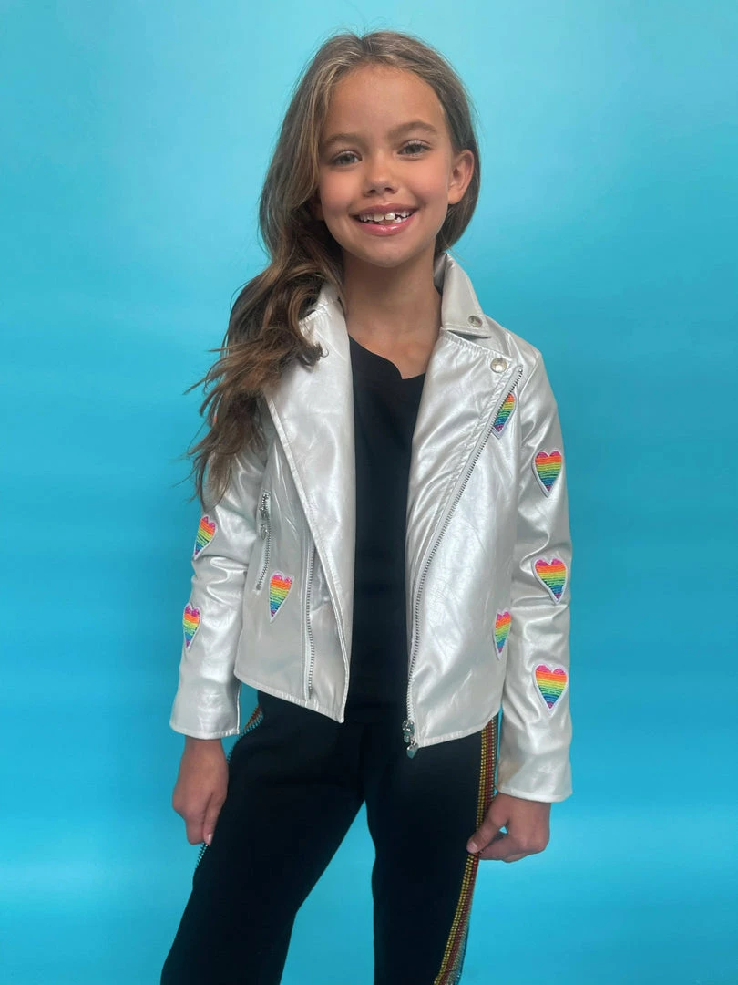 Cream shimmer champagne vegan leather jacket with rainbow beaded rainbow heart patches !ย