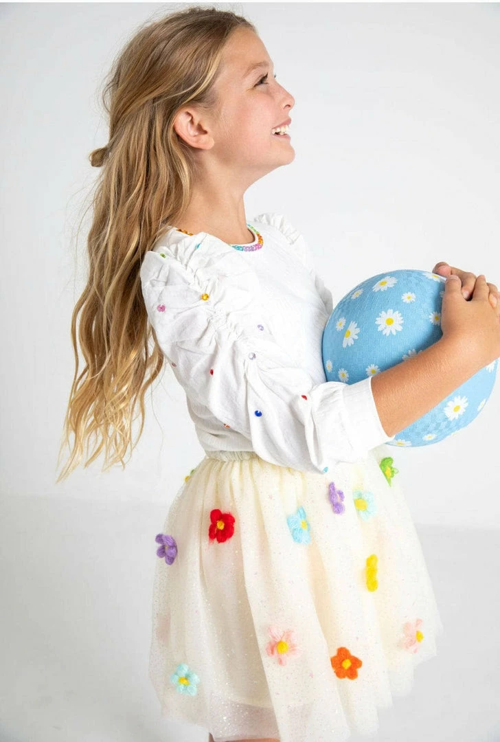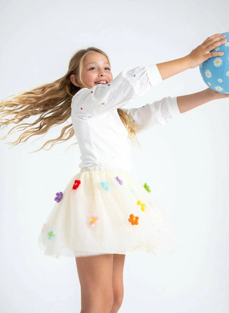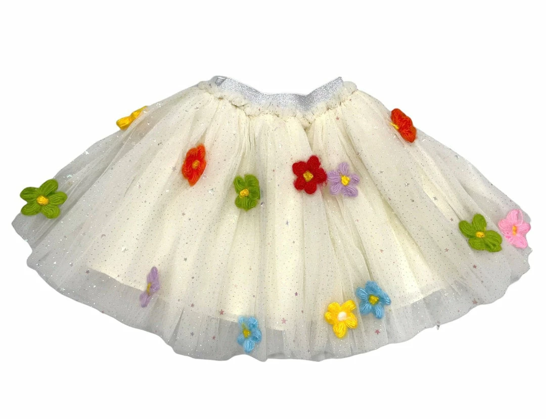Tutu fun for summer! This white tulle tutu is covered in 3D puff daisies, perfect for a party or playtime. Hand wash only.