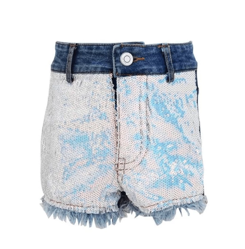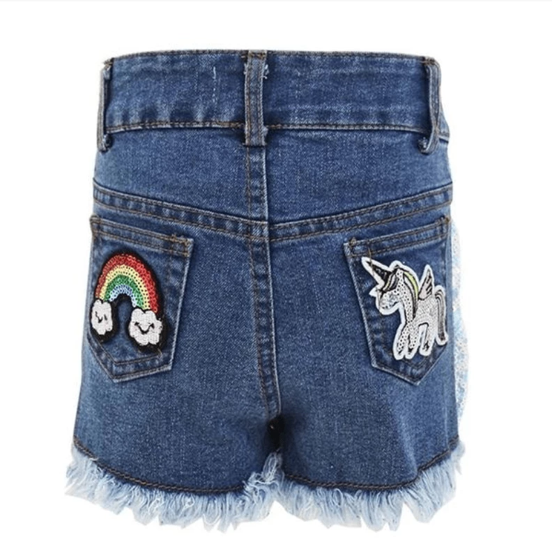 Adorable denim shorts covered in sequins on the front and embellished with rainbow and unicorn patches on the back pockets! Perfect for a day in the sun!