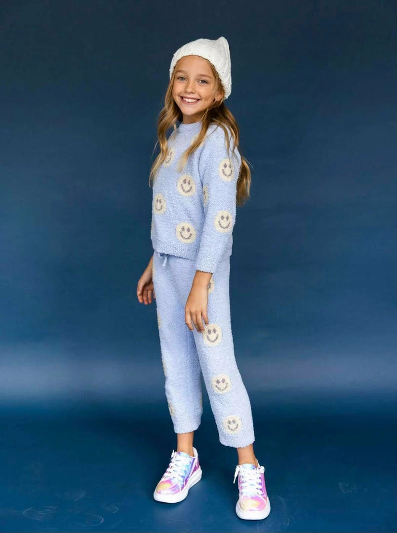 Super soft and plush baby blue crewneck and pant set covered in yellow smiley faces!Β