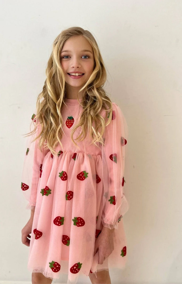 Long sleeve sweater dress with tulle overlay covered in embroidered strawberries!ย