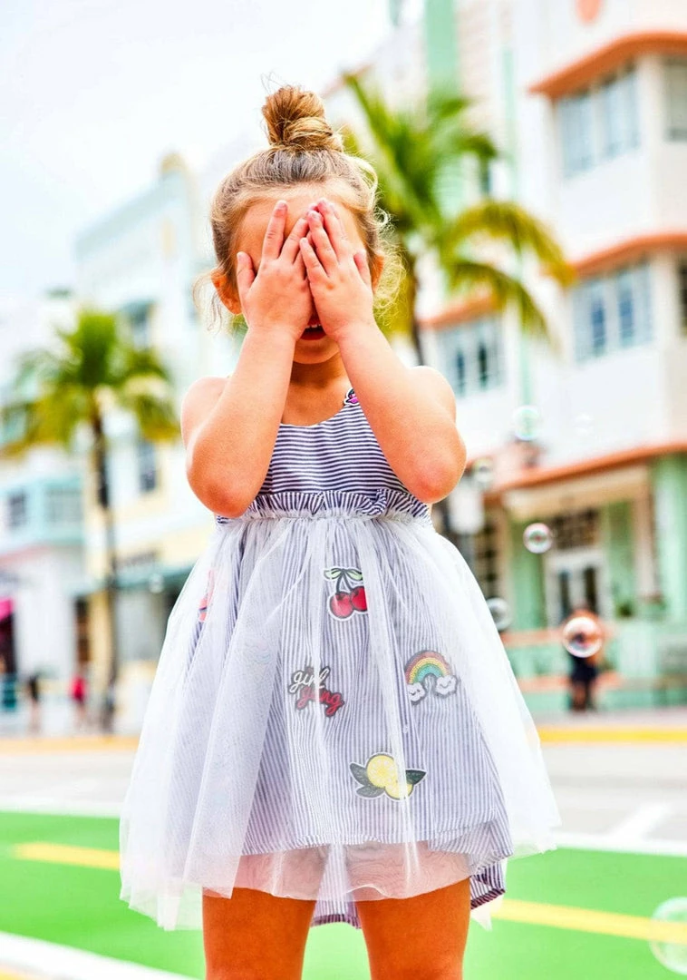 Black and white striped tshirt dress with tulle overlay covered in colorful rainbow patches and candy bead straps!ย