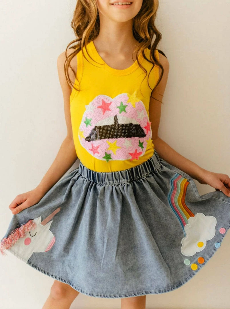 A cool denim-style skirt that can be matched to most tops your kids have on their closets. Embellished with unicorn and rainbow designs.