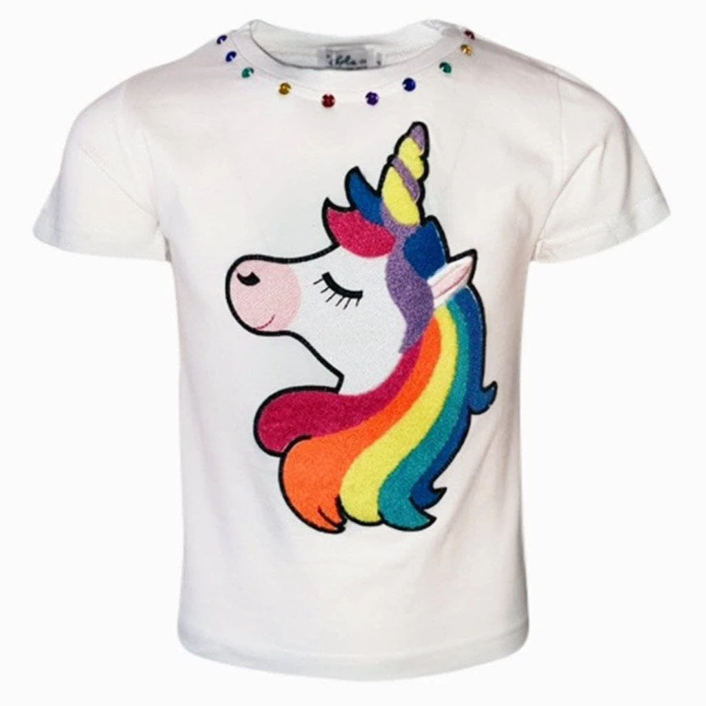 The cutest white tee with rainbow gems on the collar and neon unicorn patch front and center!ย